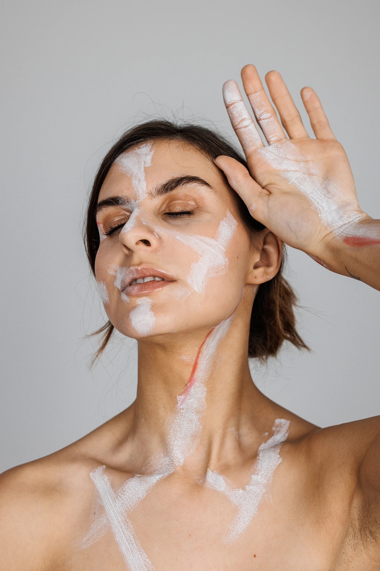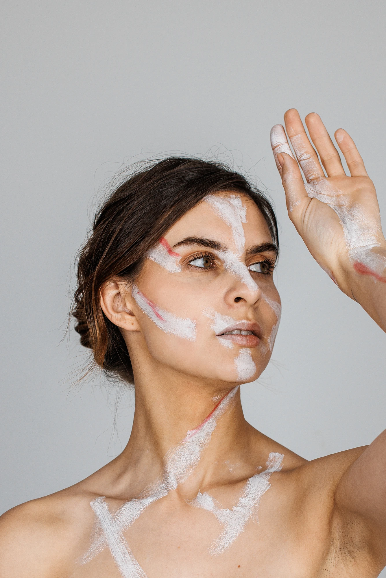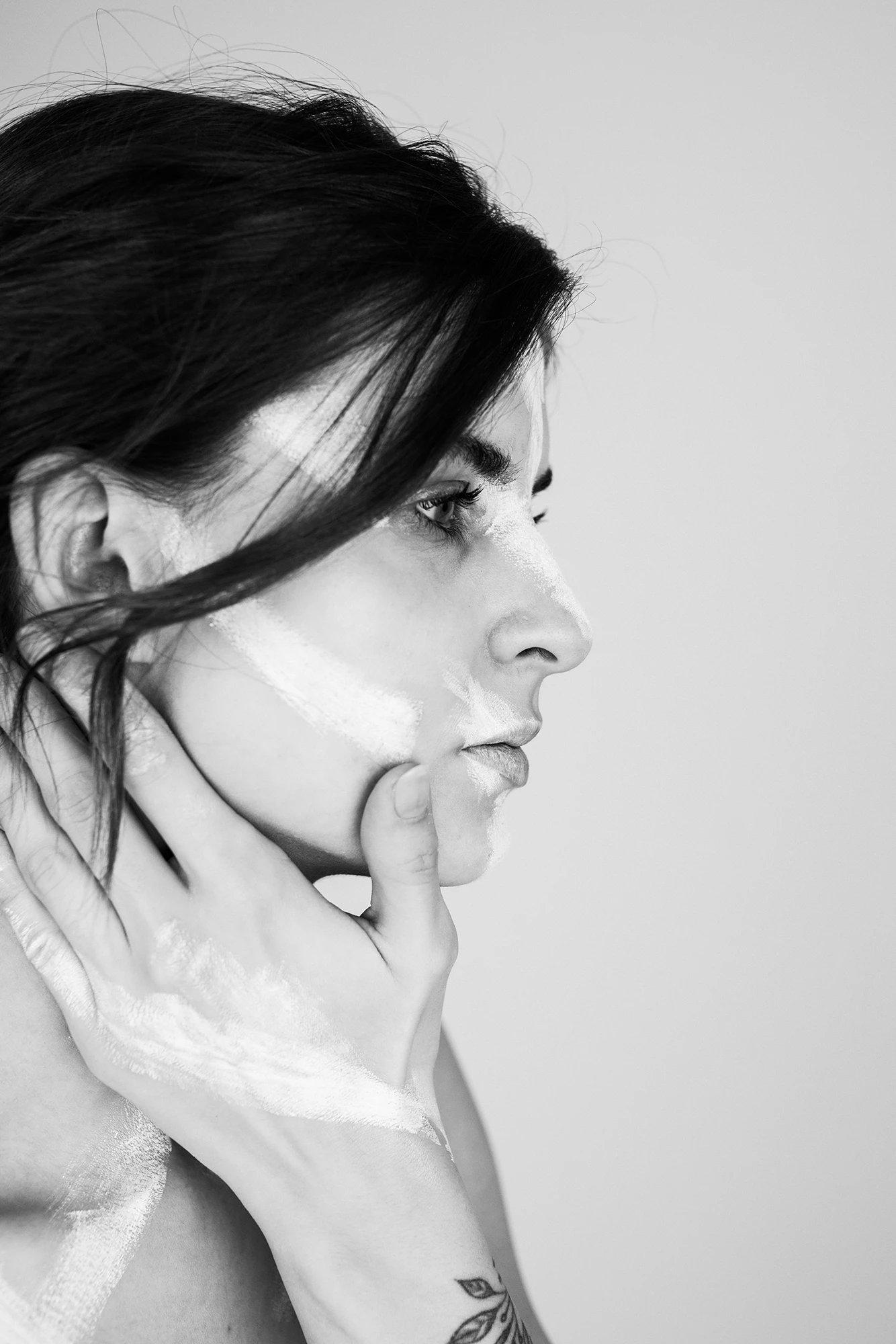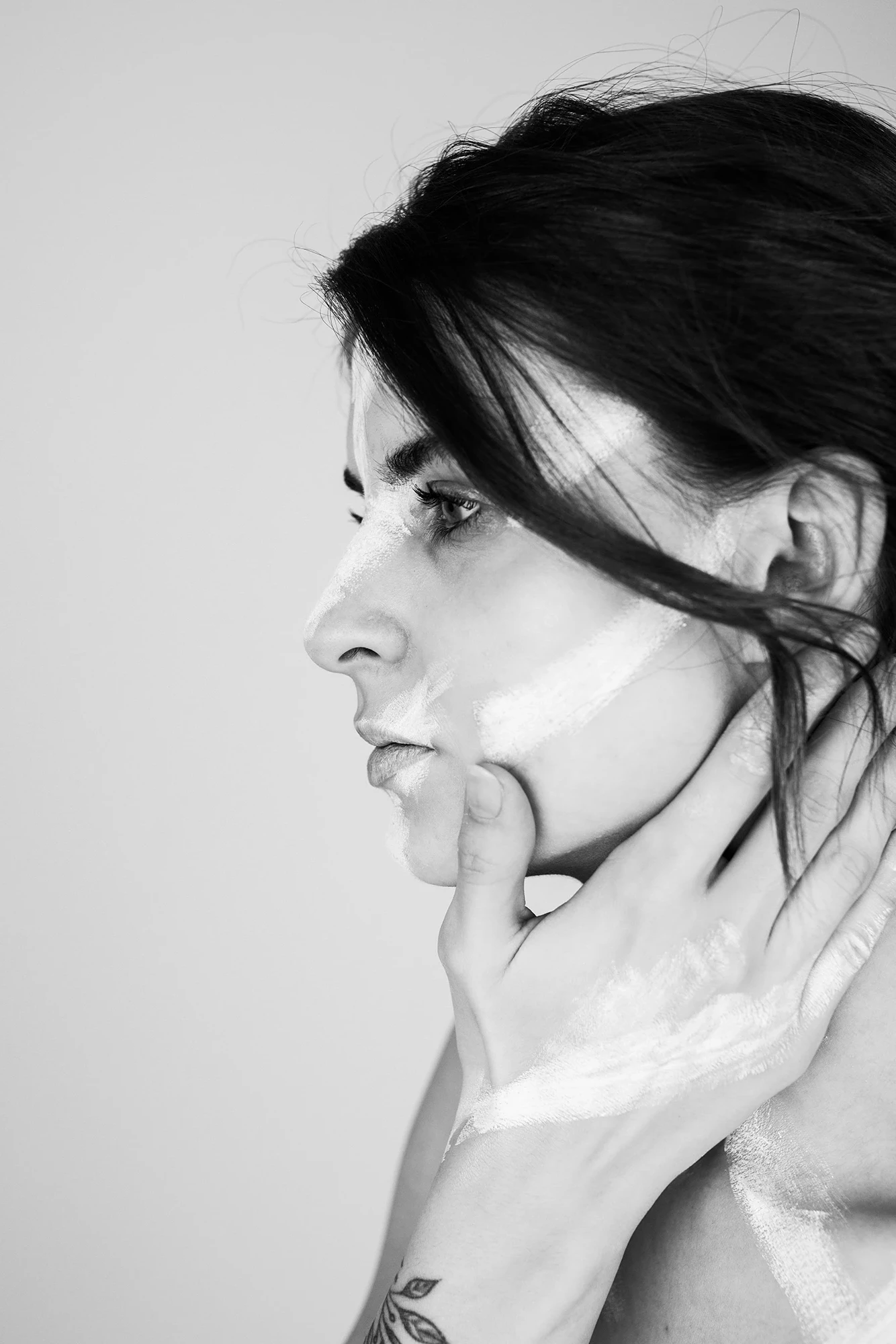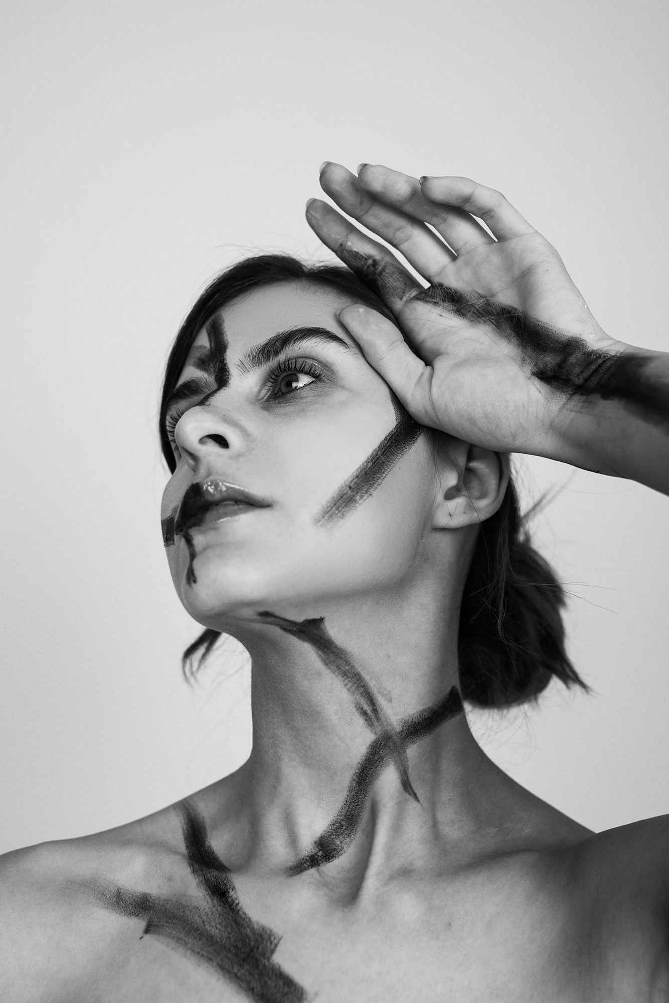 Die weiße, schwarze und farbige Bemalung auf Haut und Gesicht dient dabei als bewusst eingesetztes Gestaltungselement. Sie verstärkt Kontraste, lenkt den Blick auf bestimmte Bildbereiche und unterstützt die grafische Wirkung der Portraits. In Kombination mit ruhigem Hintergrund und klarer Lichtführung entstehen Aufnahmen, die sich an der Ästhetik moderner Editorial- und Studiofotografie orientieren.